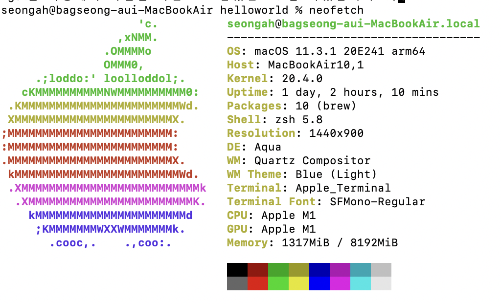 사용자의 기호에 맞게 커스텀해서 사용도 가능하다.brew install neofetch로 설치해준 후, neofetch를 입력하면 시스템 주요 정보가 표시되는 것을 확인할 수 있다.