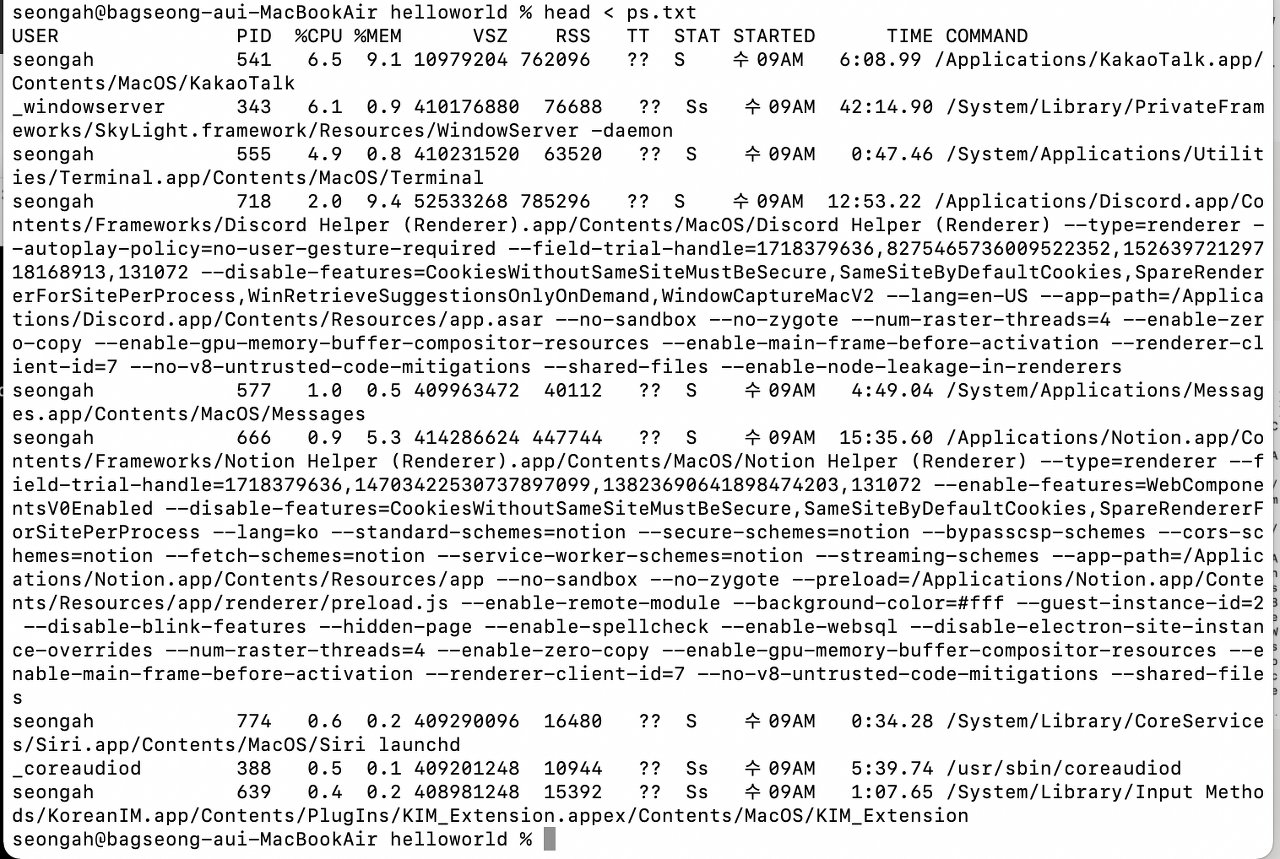 - ps.txt 내용을 head 명령의 입력 스트림을 전환하여 전송한다