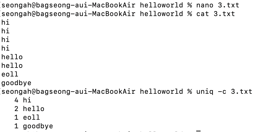 -c: 같은 라인이 몇 번 나오는지 표시-d: 중복되어 나오는 라인 중 한 라인만 표시-D: 중복되는 모든 라인 표시-N: 필터링을 무시할 라인을 정함. 시작 라인부터 N번째 라인까지는 검사하지 않는다-i: 중복 라인을 한 라인으로 생각하고 출력-u: 중복 라인이 없는 것만 출력