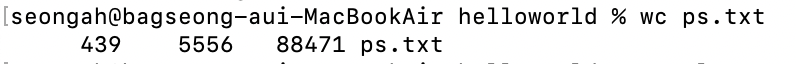 그냥 wc 명령어만 사용하면 line, word, character의 개수를 모두 출력해주고, 옵션으로 원하는 것만 출력해줄 수도 있다.