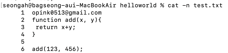 cat -n test.txt # 내용과 함께 맨 앞에 line 번호 출력
