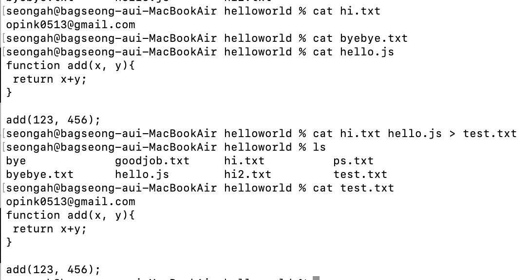 리다이렉션을 응용해보자. 만약 file1의 내용과 file2의 내용을 합쳐 file3라는 파일에 저장하고 싶다면?