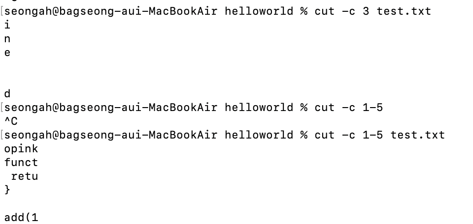 -c 문자위치 : 잘라낼 곳의 글자위치 지정. 콤마나 하이픈으로 범위 지정도 가능