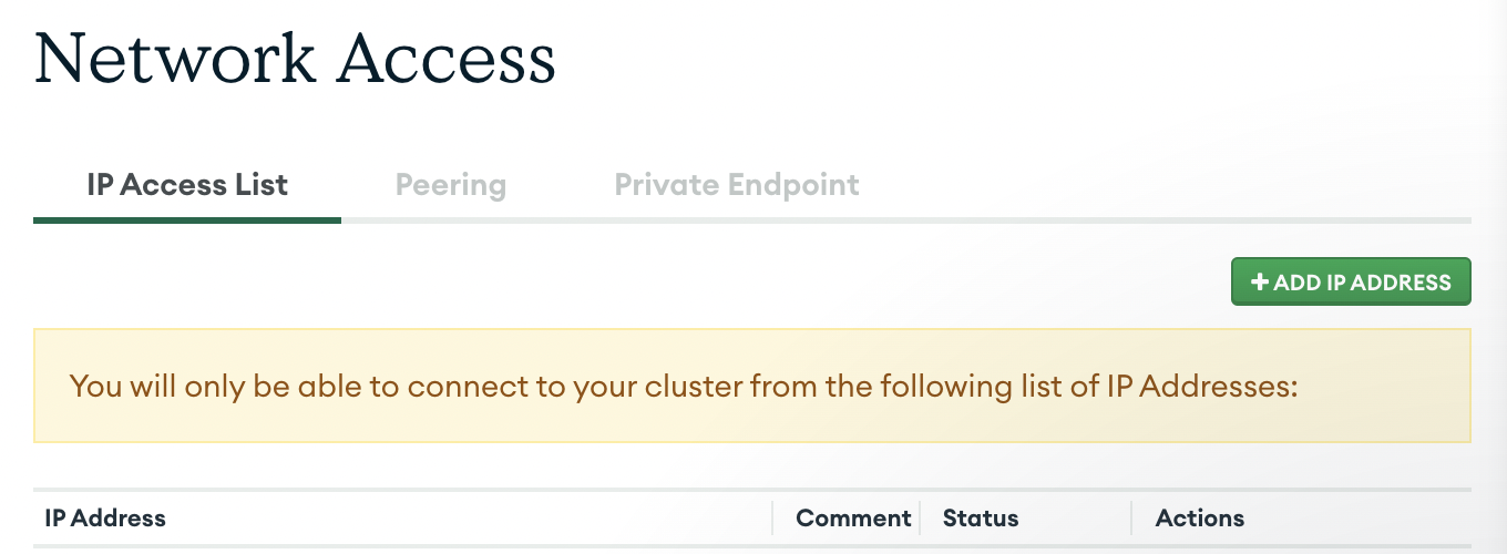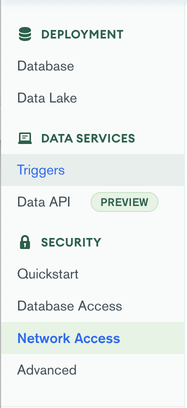 MongoDB Atlas 홈페이지에 접속 한 후, 좌측 메뉴 탭에 있는 Network Access를 클릭해준다.
