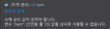 double array[num]; 으로 선언하려하면 num이 상수가 아니므로 불가하다.